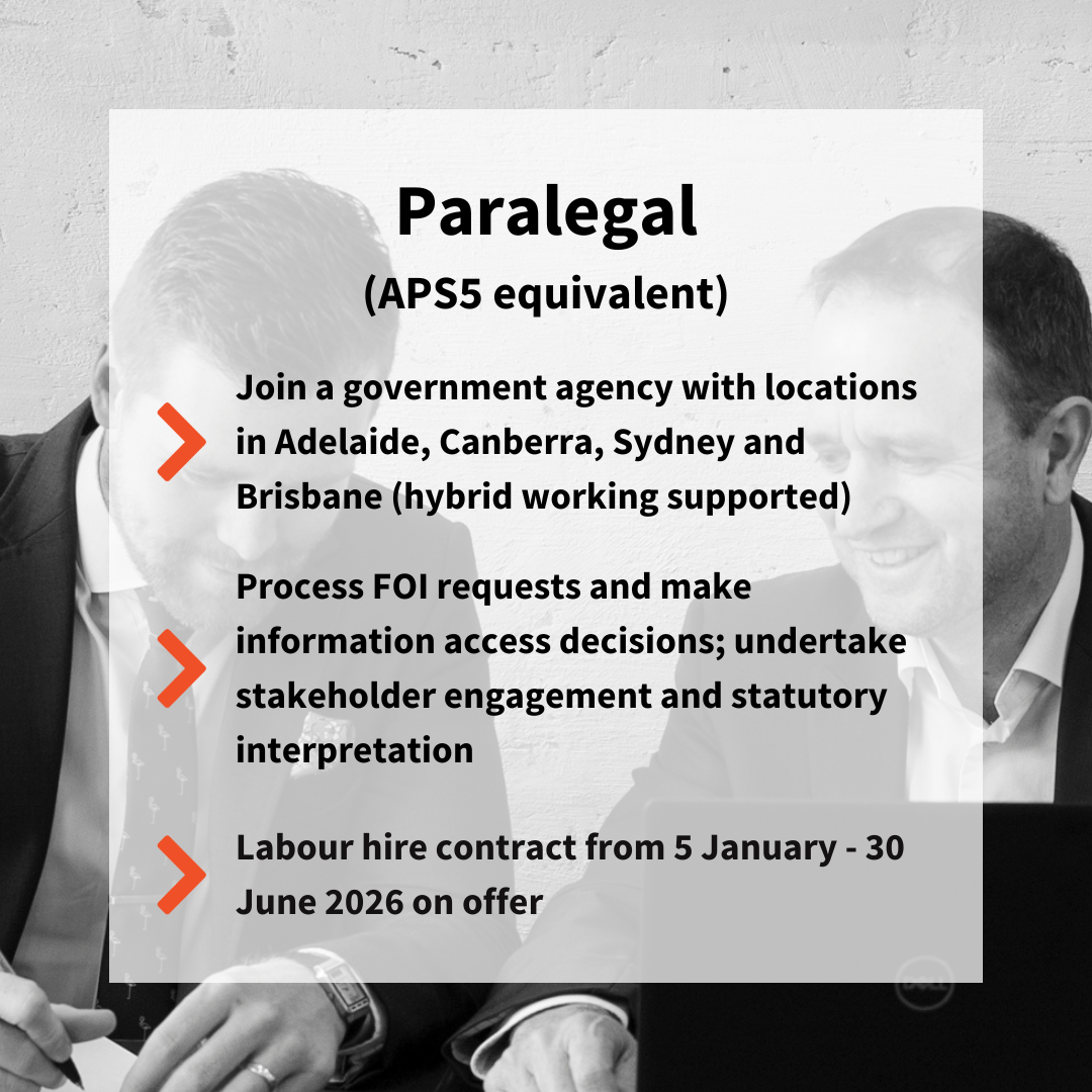 #paralegal #paralegaljobs #FOI #FOIjobs #APS5 #canberrajobs #sydneyjobs #adelaidejobs #brisbanejobs #hybridwork