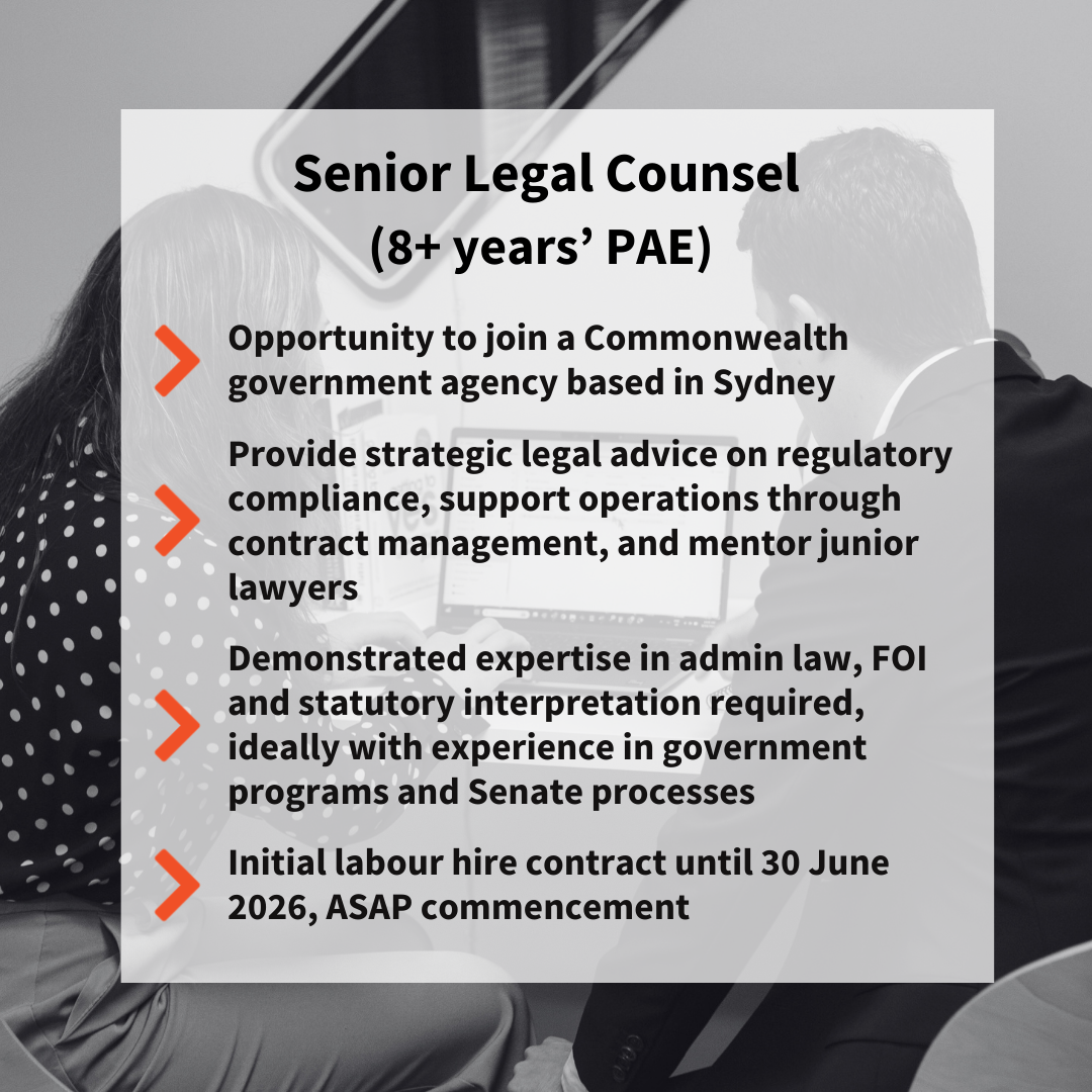 We're recruiting a Senior Associate/Special Counsel (ideally >8 years' PAE) to work with a Commonwealth government client in Sydney's CBD. You'll have demonstrated experience in admin law, FOI and statutory interpretation.