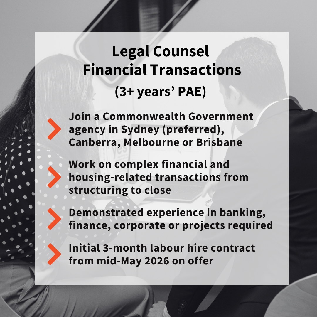 We're recruiting a Projects/Finance/Corporate lawyer (3+ years' PAE) to work with a Commonwealth government client in Sydney, Canberra, Melbourne or Brisbane. Initial three-month contract, starting mid-May 2026.